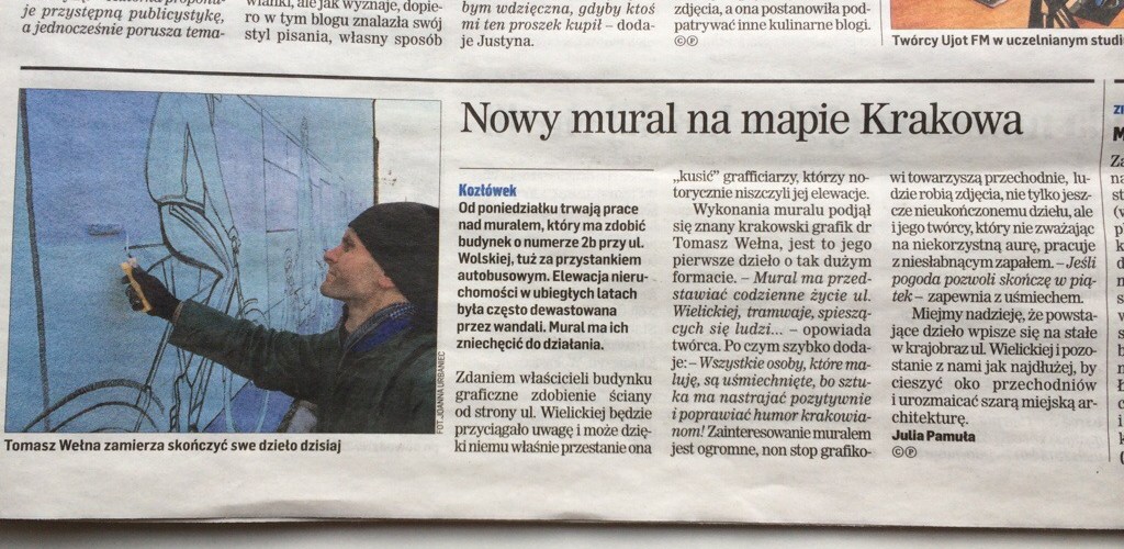 Mural w Dzienniku Polskim W piątkowym Dzienniku Polskim pojawił się artykuł o moim muralu. Ciąg dalszy prac wkrótce! Podziel się: Udostępnij na X (Otwiera się w nowym oknie) X Udostępnij w serwisie Facebook (Otwiera się w nowym oknie) Facebook Lubię Wczytywanie… Powiązane